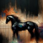 A magnificent black horse gallops powerfully against a backdrop of vibrant, swirling colors. Its glossy coat and flowing mane convey strength and elegance, embodying a sense of wild freedom.