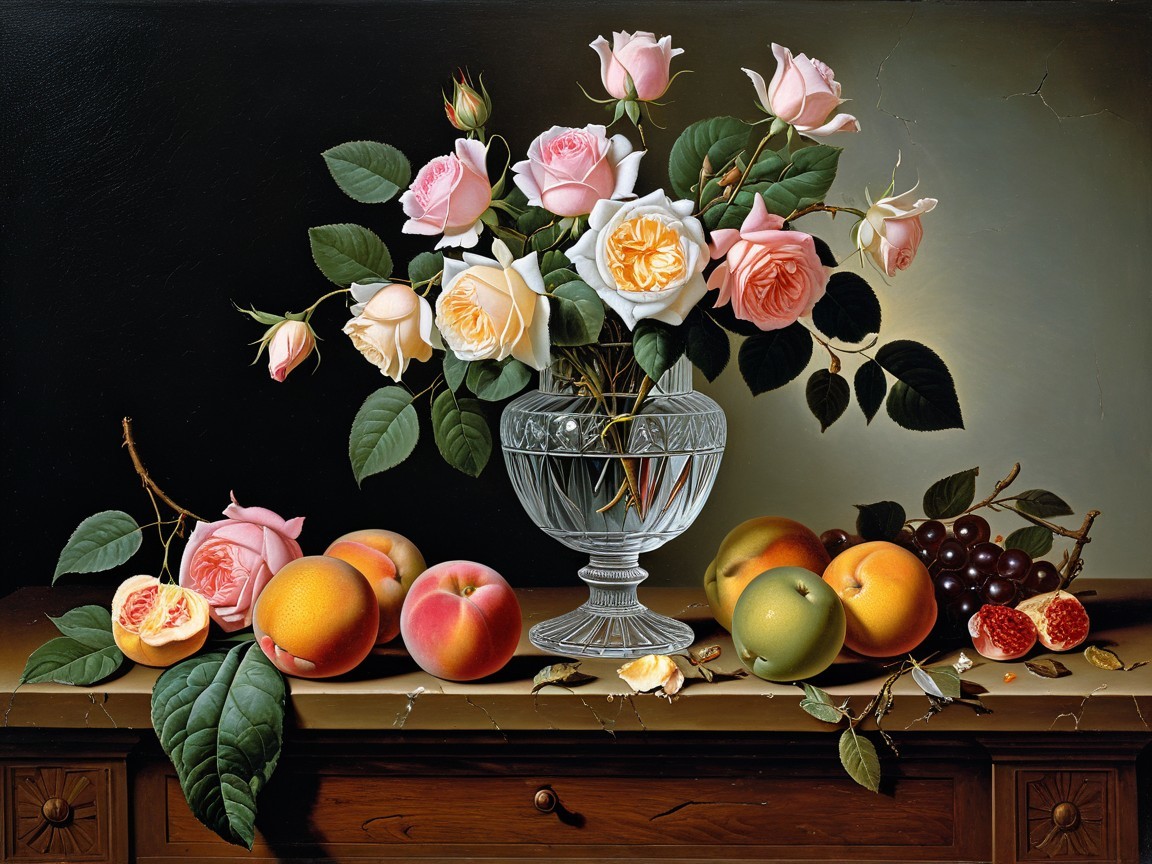 A still life painting showcasing a clear crystal vase filled with a bouquet of light pink and light yellow garden roses with verdant green leaves, elegantly placed on a dark wood table with a light brown marble top. The table is adorned with various fruits, including peaches, nectarines, and a cluster of deep