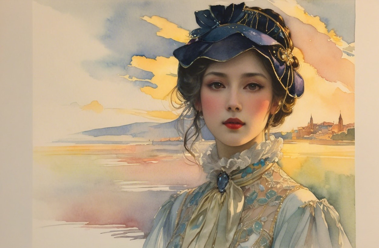 A serene young woman gazes into the distance, adorned with a delicate headband and vintage attire. The soft watercolor background features a beautiful sunset over a calm body of water.