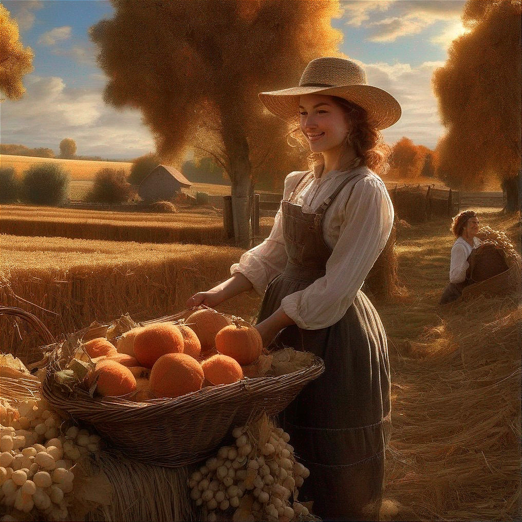 A woman wearing a straw hat and apron smiles while picking pumpkins in a golden field at sunset, with another person in the background.