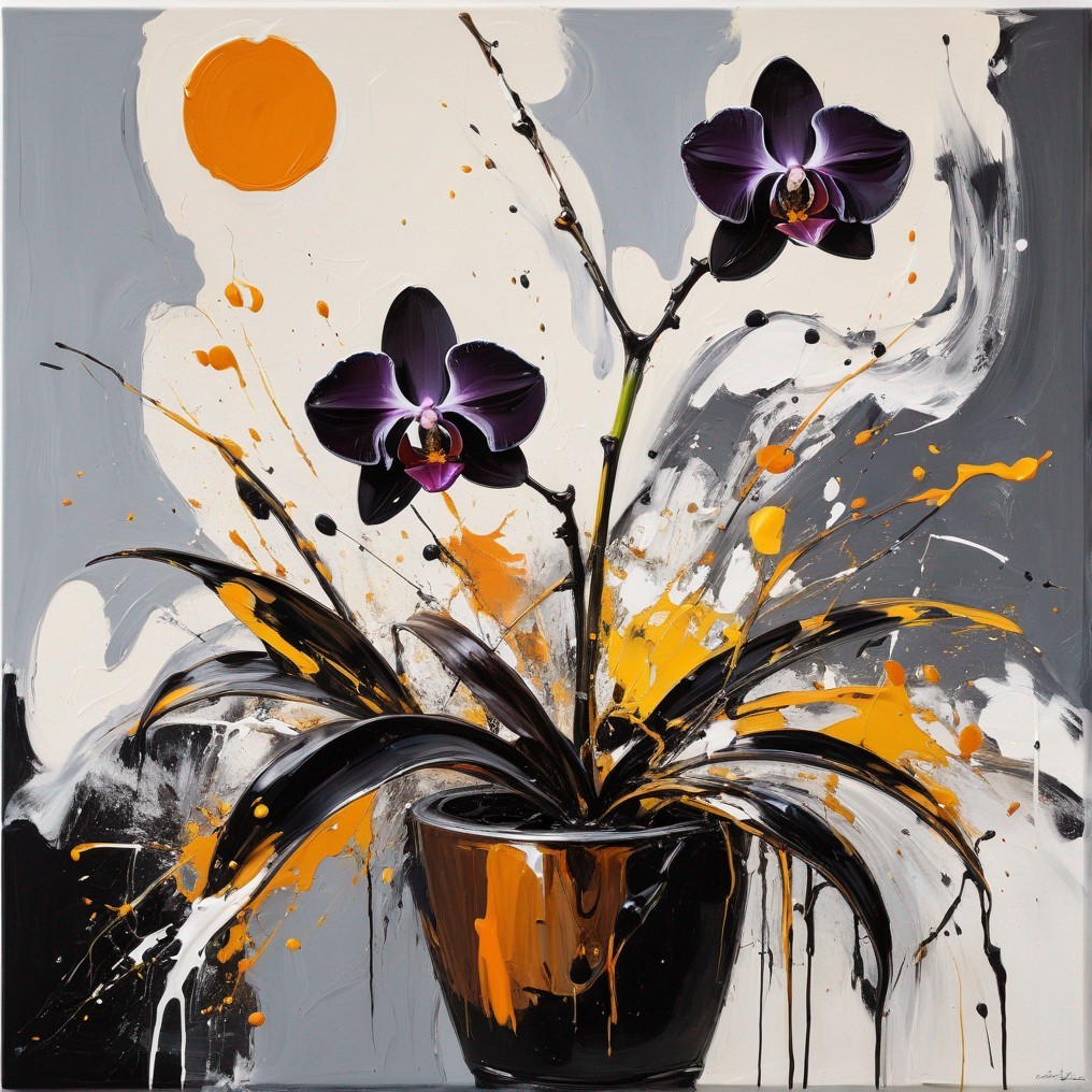 A vibrant painting of dark purple orchids in a pot, with a splash of orange and yellow paint, against a grey and white background with a sun.