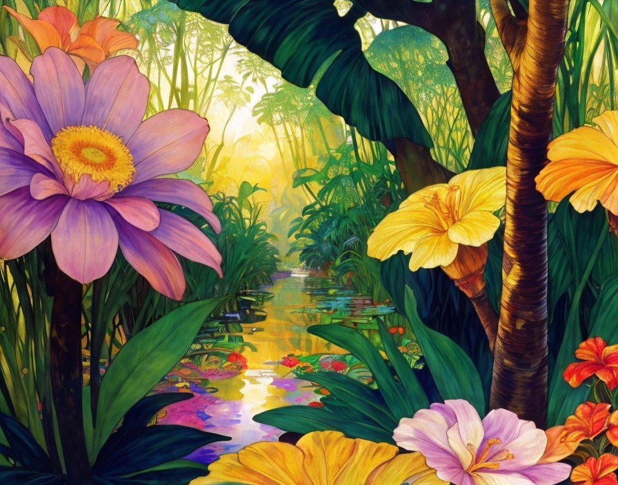 Full page, single image, 3D watercolor patchwork, Beautiful high-definition sunrise rainforest, stream, tropical flowers, by Alphonse Mucha with elements of Tingatinga style, Jan Toorop style and Gustav Klimt style