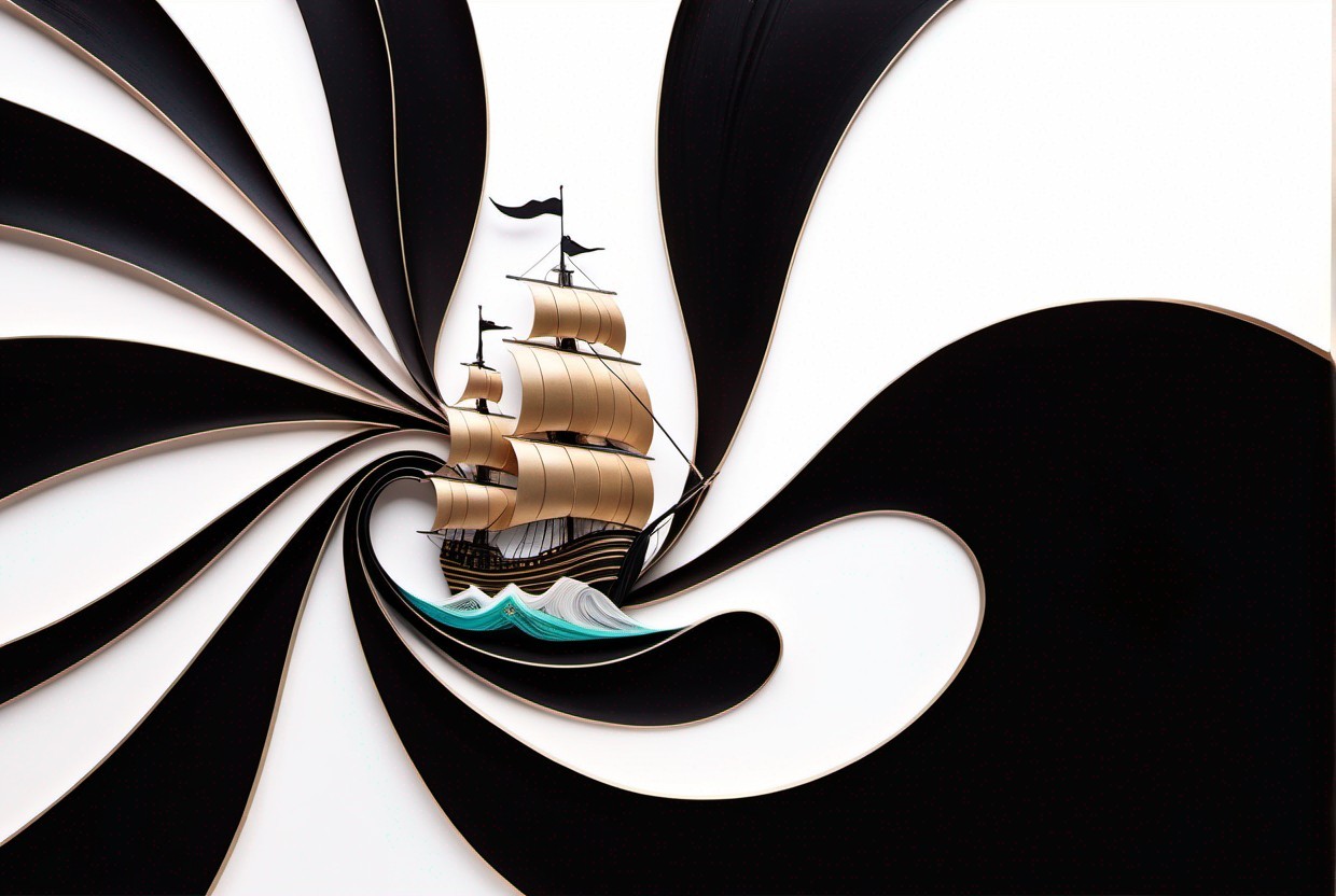 An abstract surreal painting of an old galleon sailing in a surreal storm sea; symbolism; clear details with 3D texture brushlines; very very soft quilling; in the style of Hieronymus Bosch, Mandy Disher; light background; white brown black gold and bronze, nature-inspired pieces; Bess Hamiti; multi-layered style; whimsical nature; ink painting; surreal style;