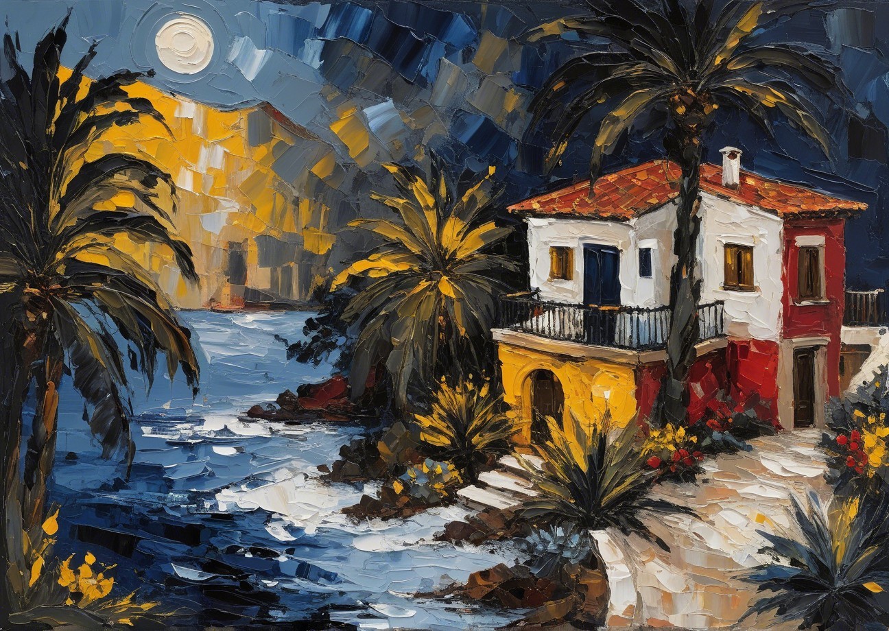 A moonlit scene of colourful Mediterranean houses with red and yellow walls, surrounded by lush palms and blooming flowers.