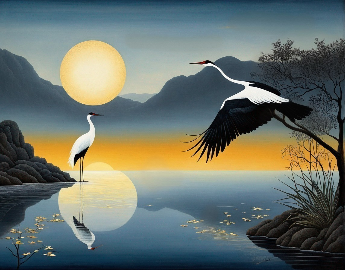 A serene painting of two cranes by a lake at sunset, with mountains in the background and a large luminous moon overhead.