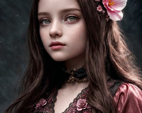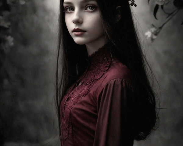 A young girl with long dark hair, wearing a deep burgundy dress, gazes softly into the distance. She has roses in her hair and a dreamy, ethereal expression amidst a misty, floral backdrop.