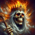 A regal skeleton adorned in ornate armor, crowned with a blazing headdress, holds a torch alight. The dramatic background features ominous clouds and hints at a fantasy realm.