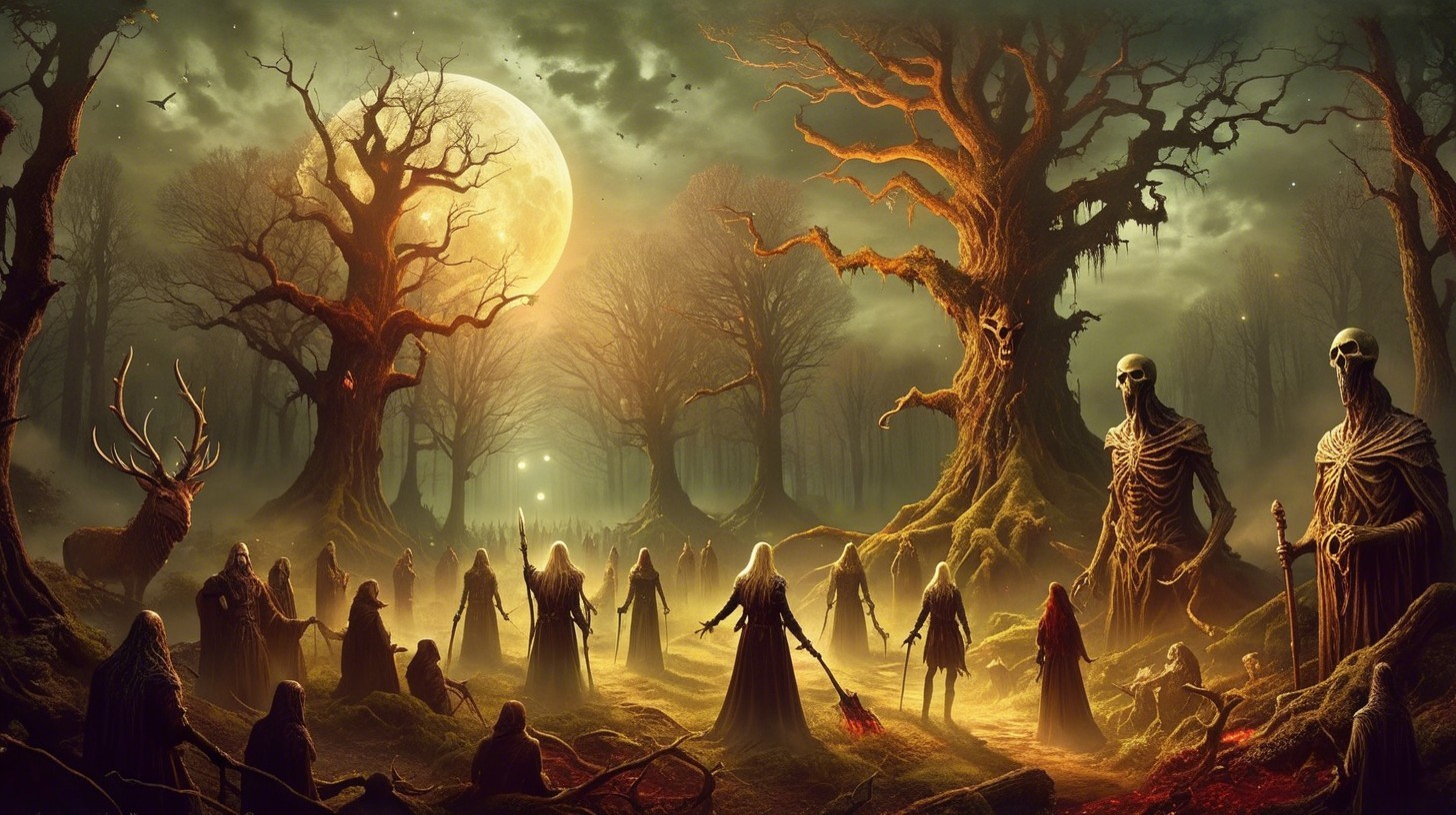Prompt: "Pagan, folk horror, forest glade sacrifice..