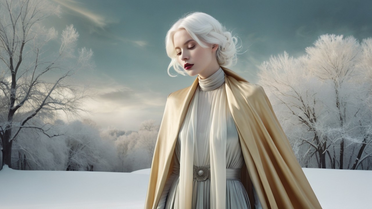 A serene figure with white hair stands in a winter landscape, wearing a flowing gown and a golden cape. Snow-covered trees frame a muted sky, creating a dreamy, ethereal atmosphere.