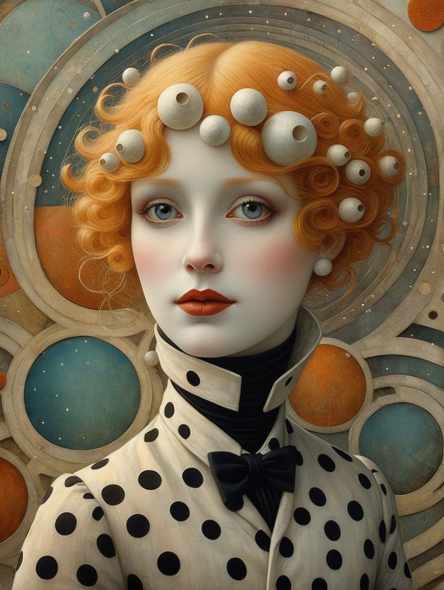 An ethereal figure with curly blonde hair and striking features gazes from a patterned background. Dressed in a polka-dotted coat, a bold red earring adds a whimsical touch.