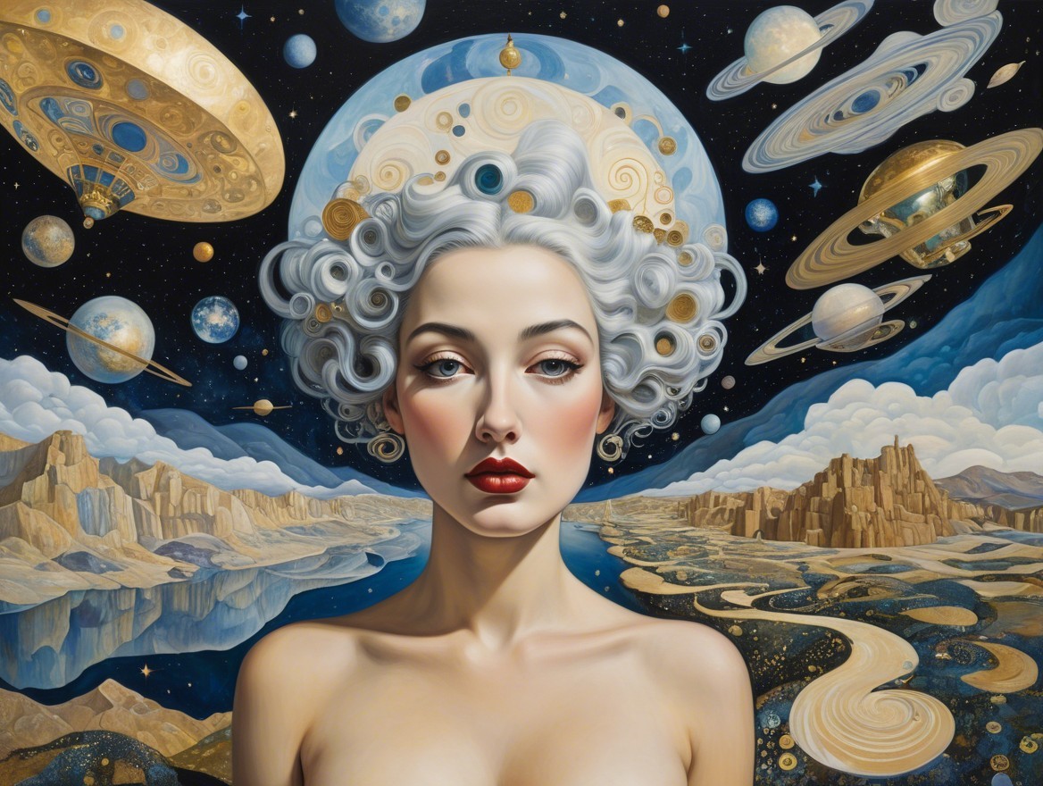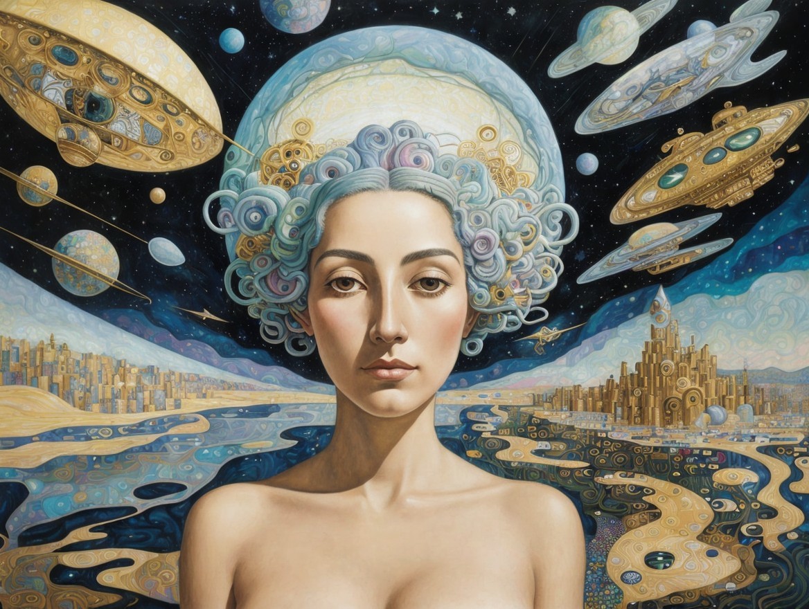 In the style of klimt. The subject matter encompasses the notion of collective awareness, celestial expanse, enlightenments, the interconnectedness of the macrocosm and microcosm, artistic styles reminiscent of Salvador Dali, Caitlin Hacket, Camille Rosa Garcia, and Aaron Horkey, surrealism, fantastical elements, visionary depictions, illustrative compositions, conceptual artwork, watercolor medium, absence of textual elements, absence of personal signatures, resolution of 64K. The aforementioned attributes are further enhanced by the inclusion of highly intricate digital paintings, refined elegance, imaginative vistas, cutting-edge 4K three-dimensional rendering, impeccable clarity, vibrant hues, and a nod to the artistic genius of Salvador Dali.