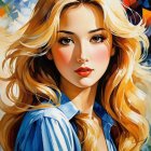 A vibrant, stylized portrait of a young woman with flowing hair adorned with colorful fruits and flowers, set against a bright, abstract background filled with warm tones.
