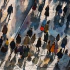 A bustling city scene in monochrome, with silhouettes of people walking amidst tall buildings. The wet pavement reflects the urban landscape, creating a dynamic, atmospheric view.