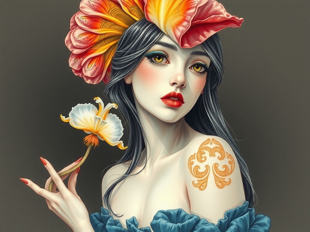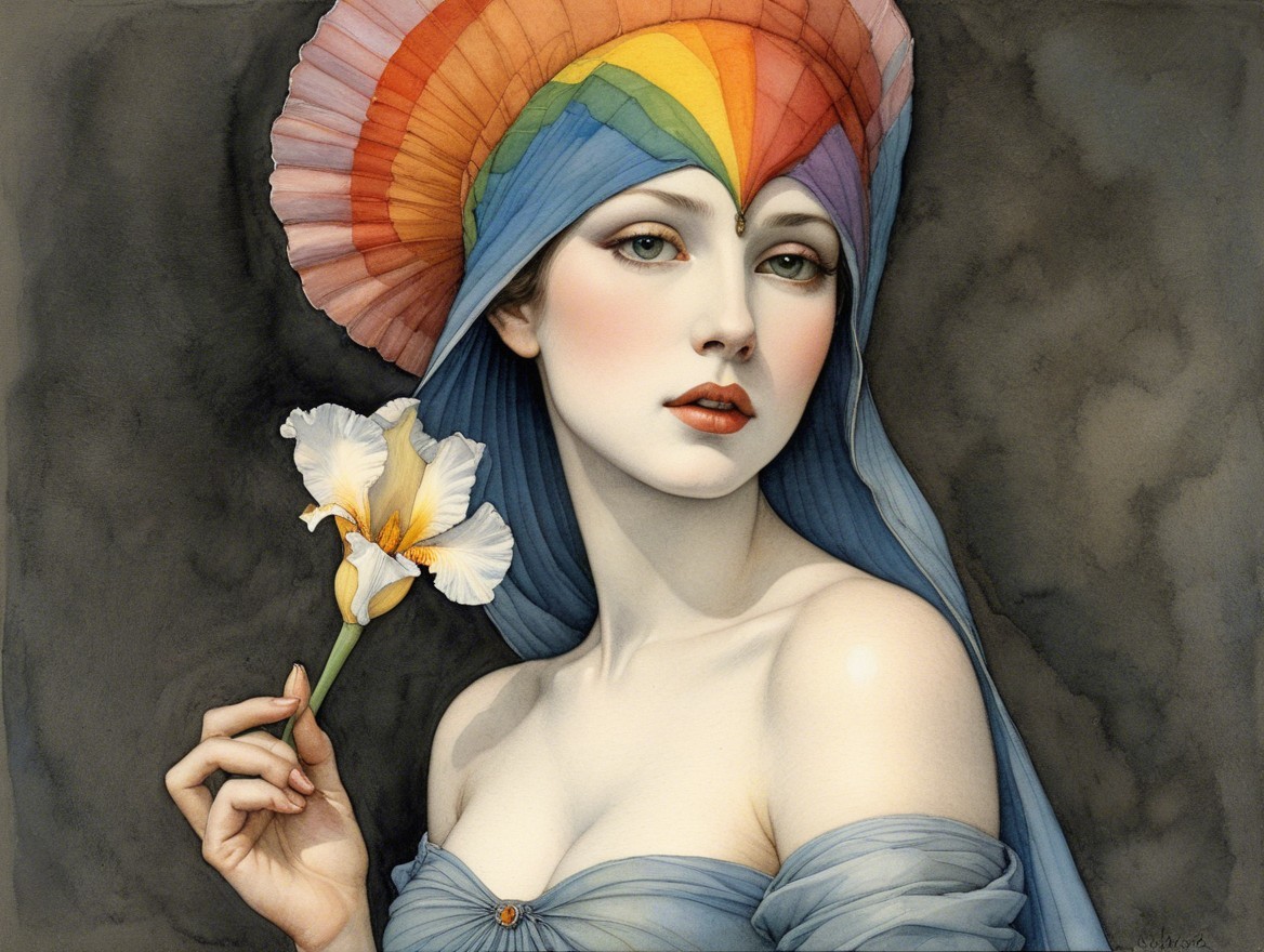 An artistic illustration of a woman with colorful headwear holding an iris flower, featuring soft tones and delicate detailing.