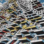 The image showcases a vibrant, geometric architectural design featuring colorful, stacked balconies and intricate structures against a dramatic sky, combining creativity and intricate detail.