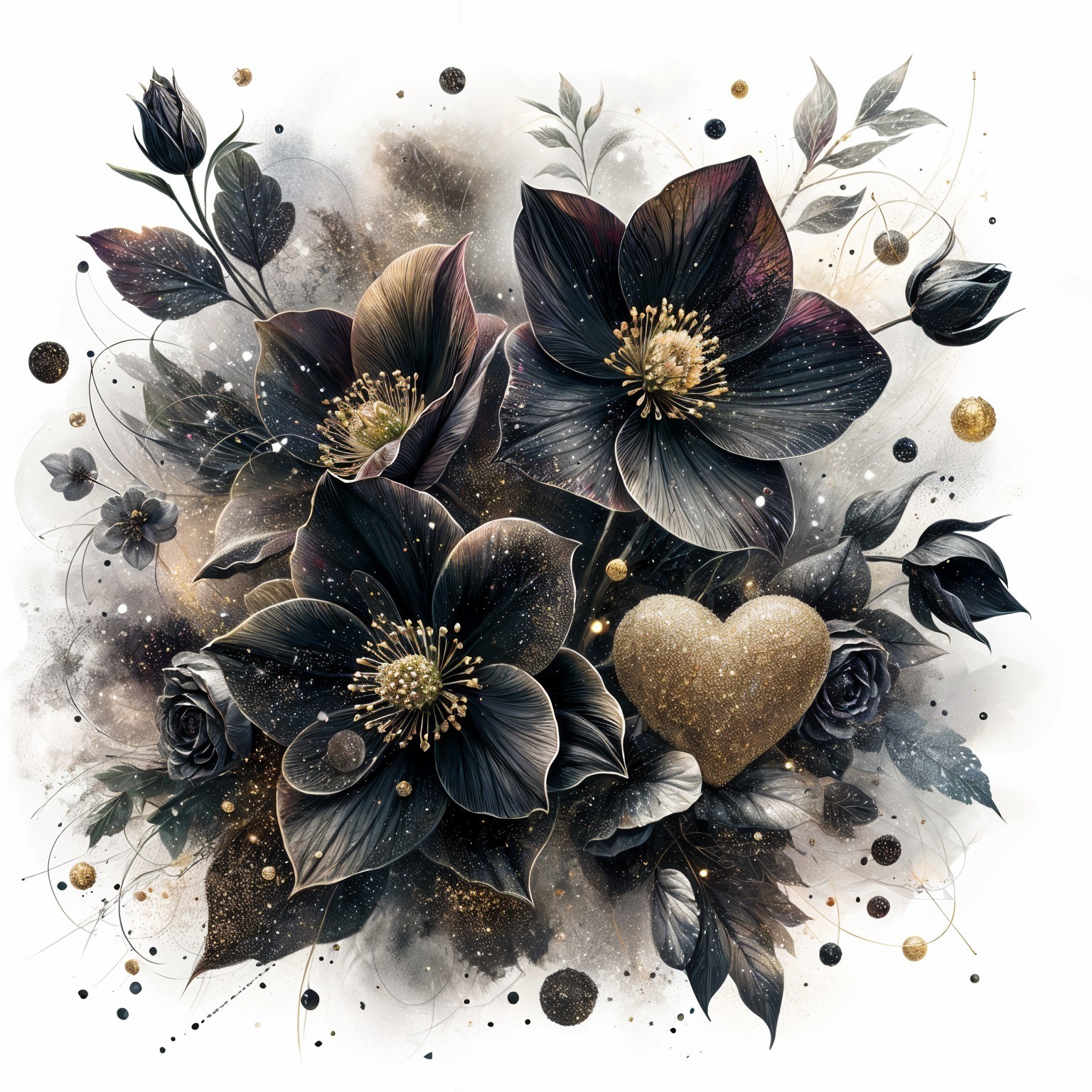 A bouquet of monochromatic dark hellebore flowers, also known as winter roses or Lenten roses, arranged on a white background with a large golden glittery heart. The flowers are in various stages of bloom, with some fully open revealing light yellow stamens and others as closed buds. The petals exhibit