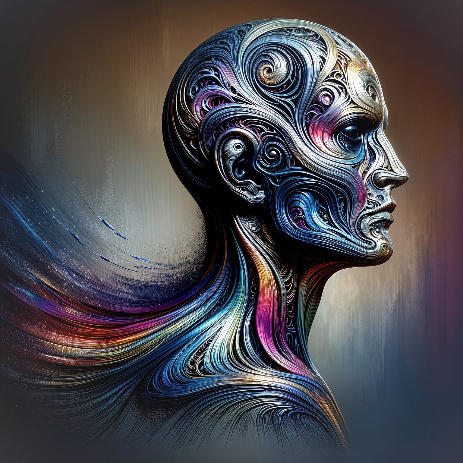 The image features a stylized human head in profile, adorned with intricate swirls and vibrant colors, suggesting fluidity and creativity, merging art and the essence of thought.