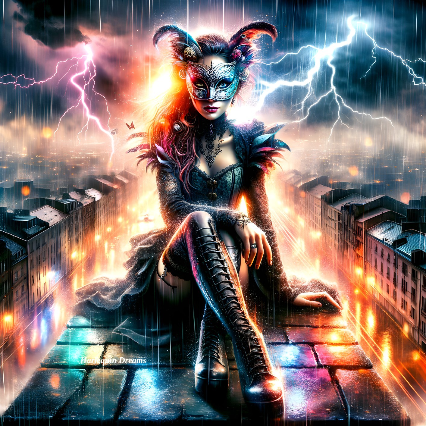 A vibrant artwork of a woman in a mask and costume with thunderstorms in the background, giving a fantasy sci-fi ambiance.