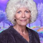 A woman with short, curly platinum hair and striking green eyes gazes softly at the camera, set against a dreamy twilight backdrop with a glowing sky and city lights.