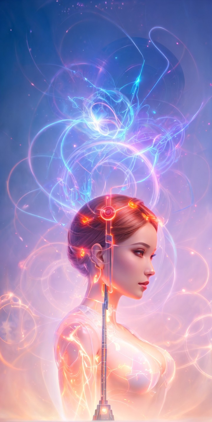 A digital artwork of a woman with an elaborate, glowing hairstyle and futuristic ornaments against a vibrant, colorful background.