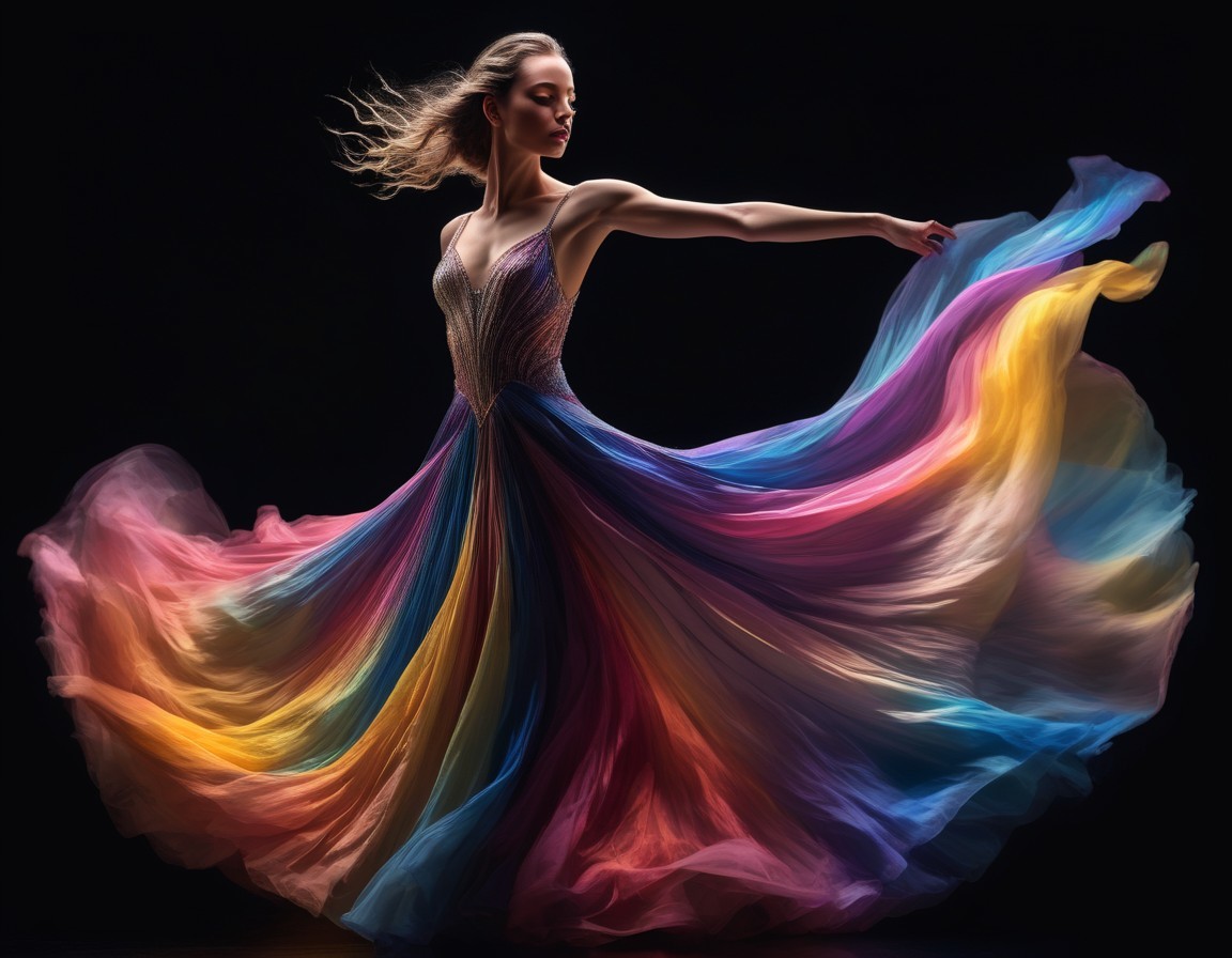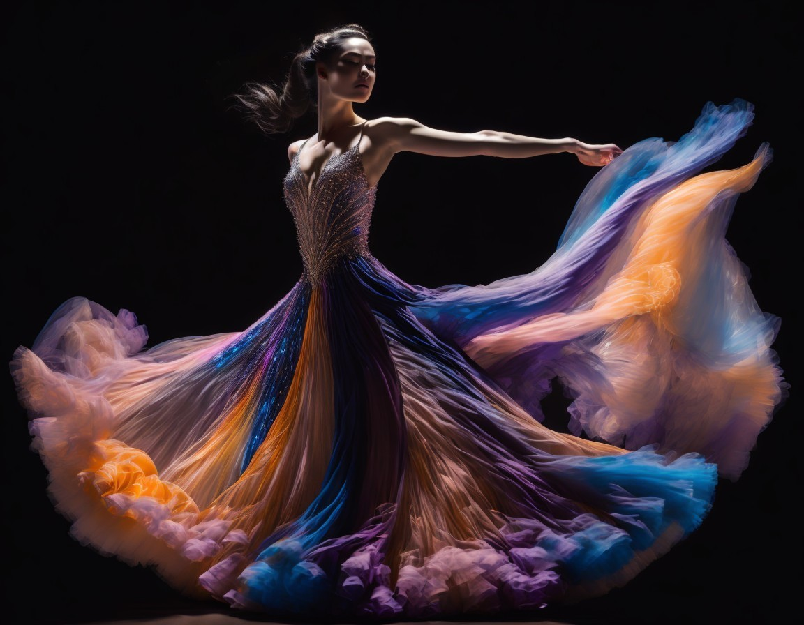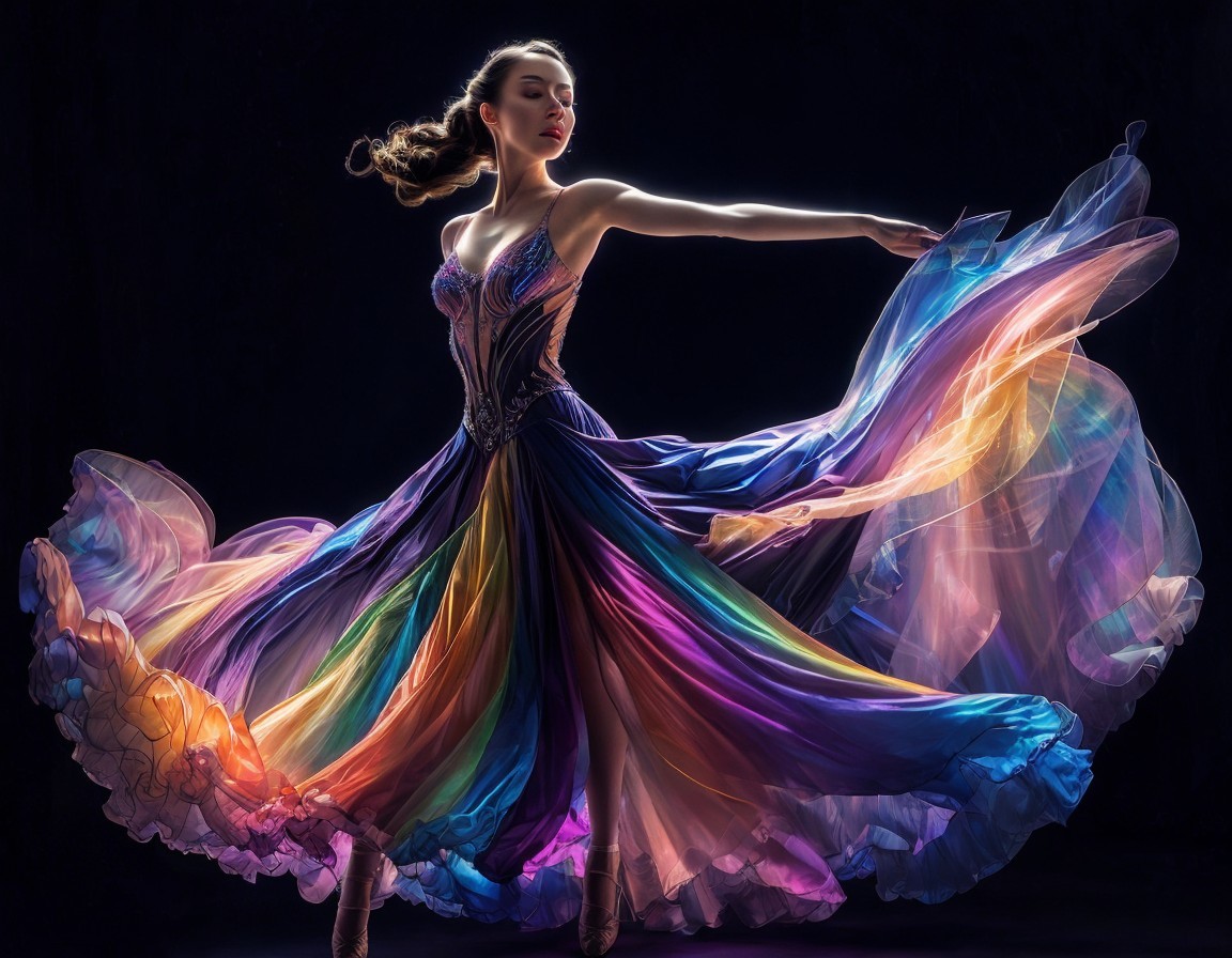 A dancer in a vibrant, flowing dress with rainbow hues poses elegantly against a dark background.