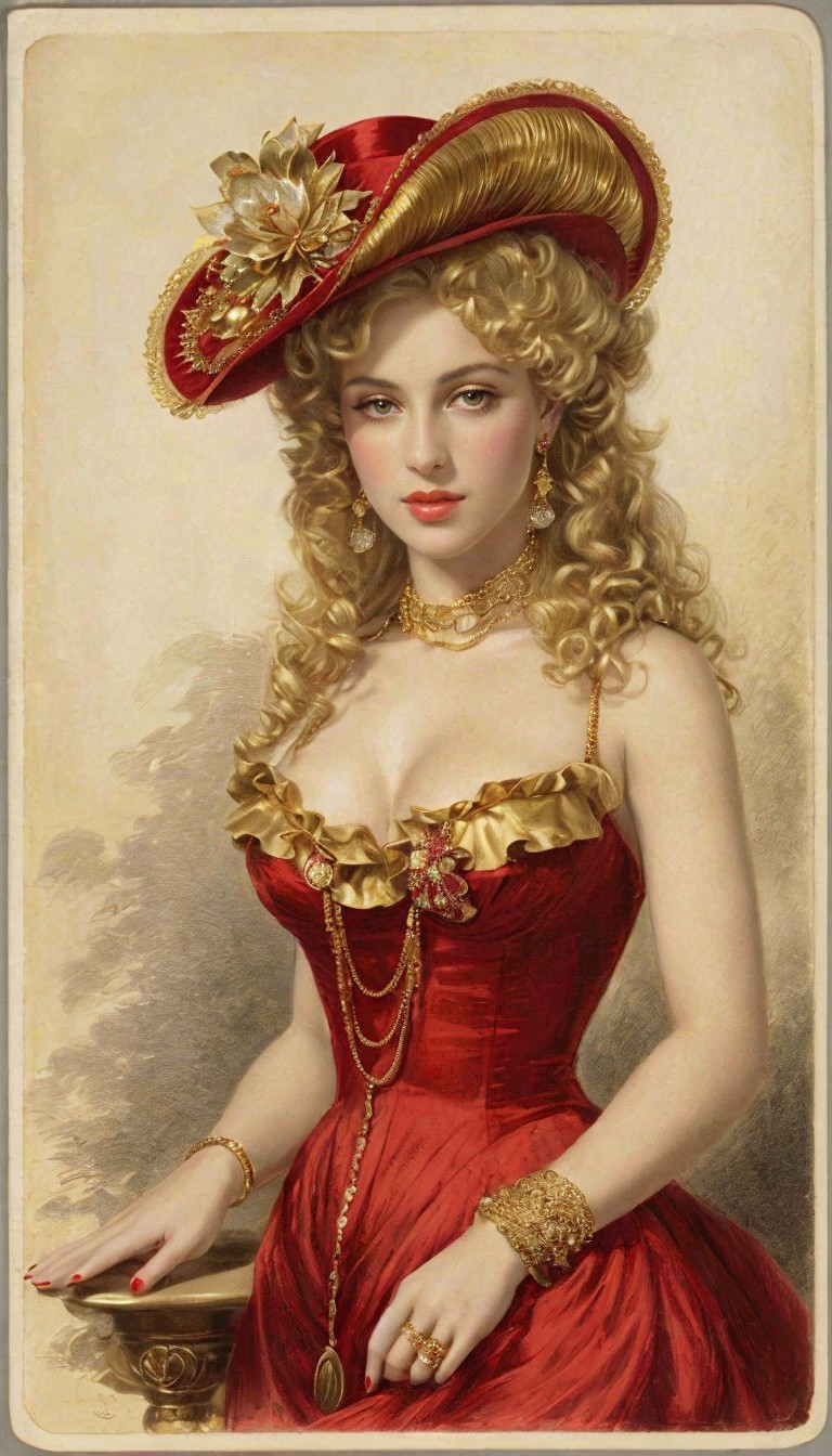 The image depicts a glamorous woman in a stunning red dress, adorned with gold accents. She wears an elaborate red hat decorated with flowers and elegant jewelry, exuding regality and beauty.