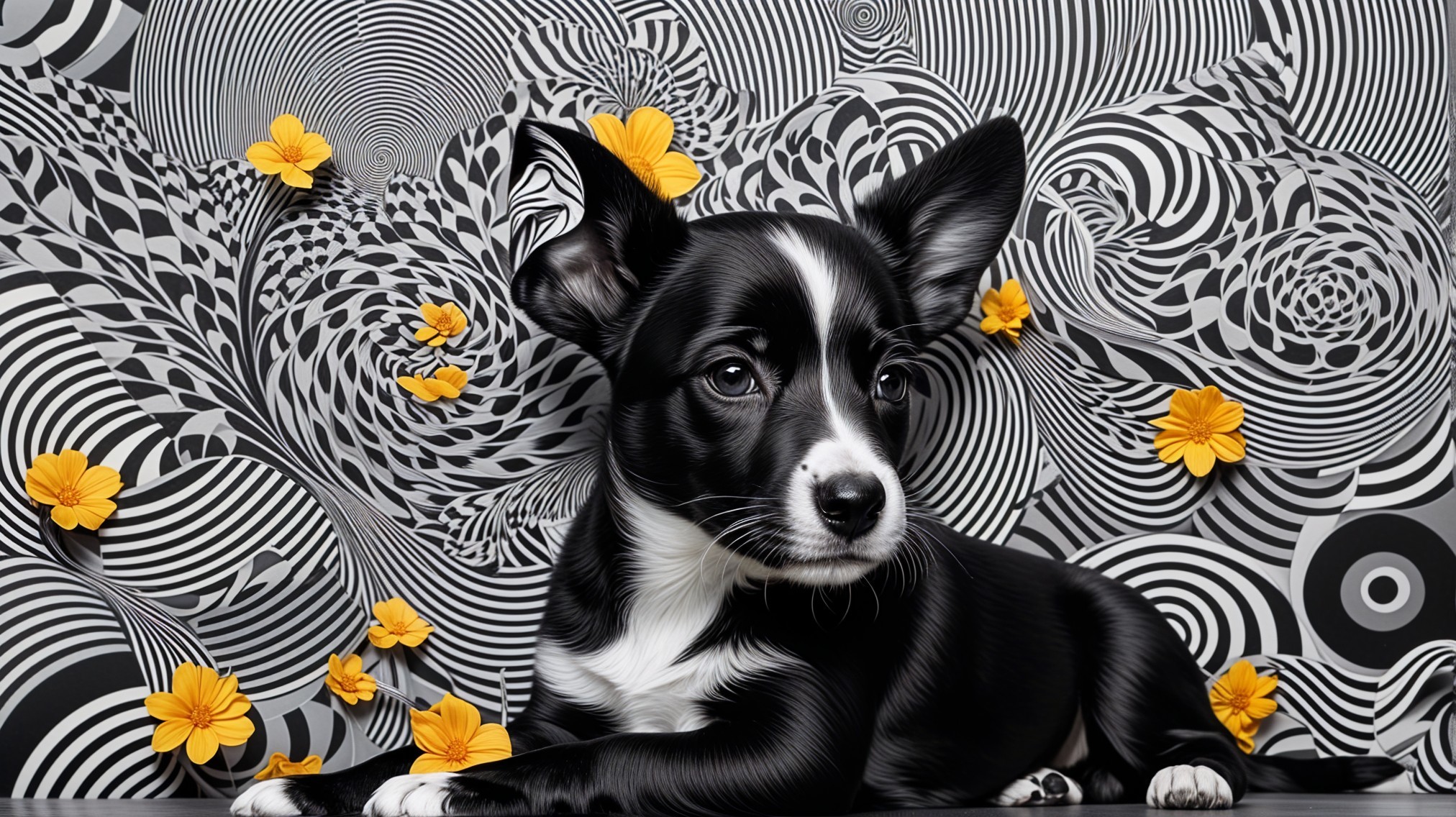 A playful black and white puppy rests against a vibrant swirling backdrop. Bright yellow flowers pop against the hypnotic patterns, creating an eye-catching, whimsical scene.
