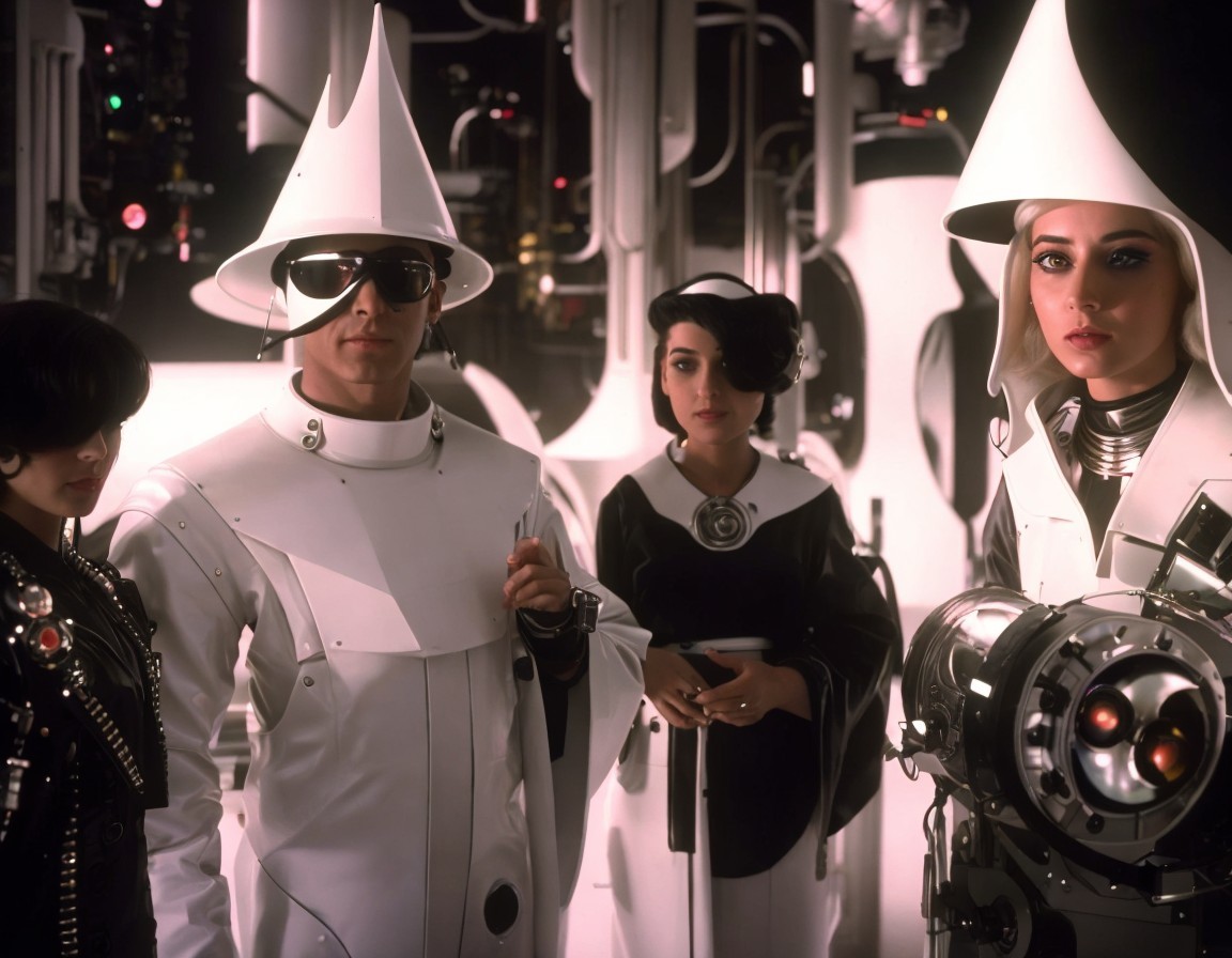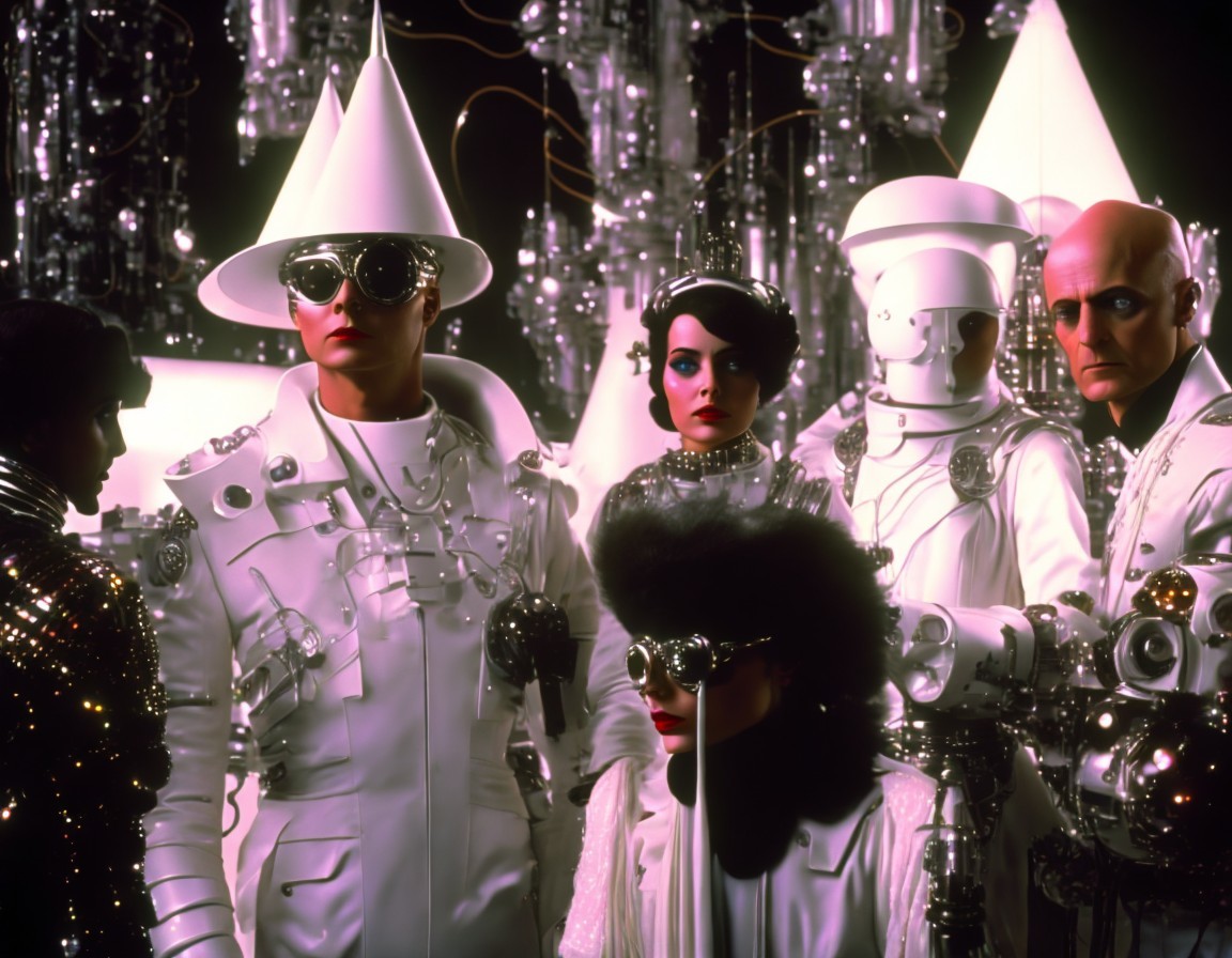 Group of individuals in futuristic white outfits and cone hats, with sleek, stylized design, suggesting a sci-fi or avant-garde theme.