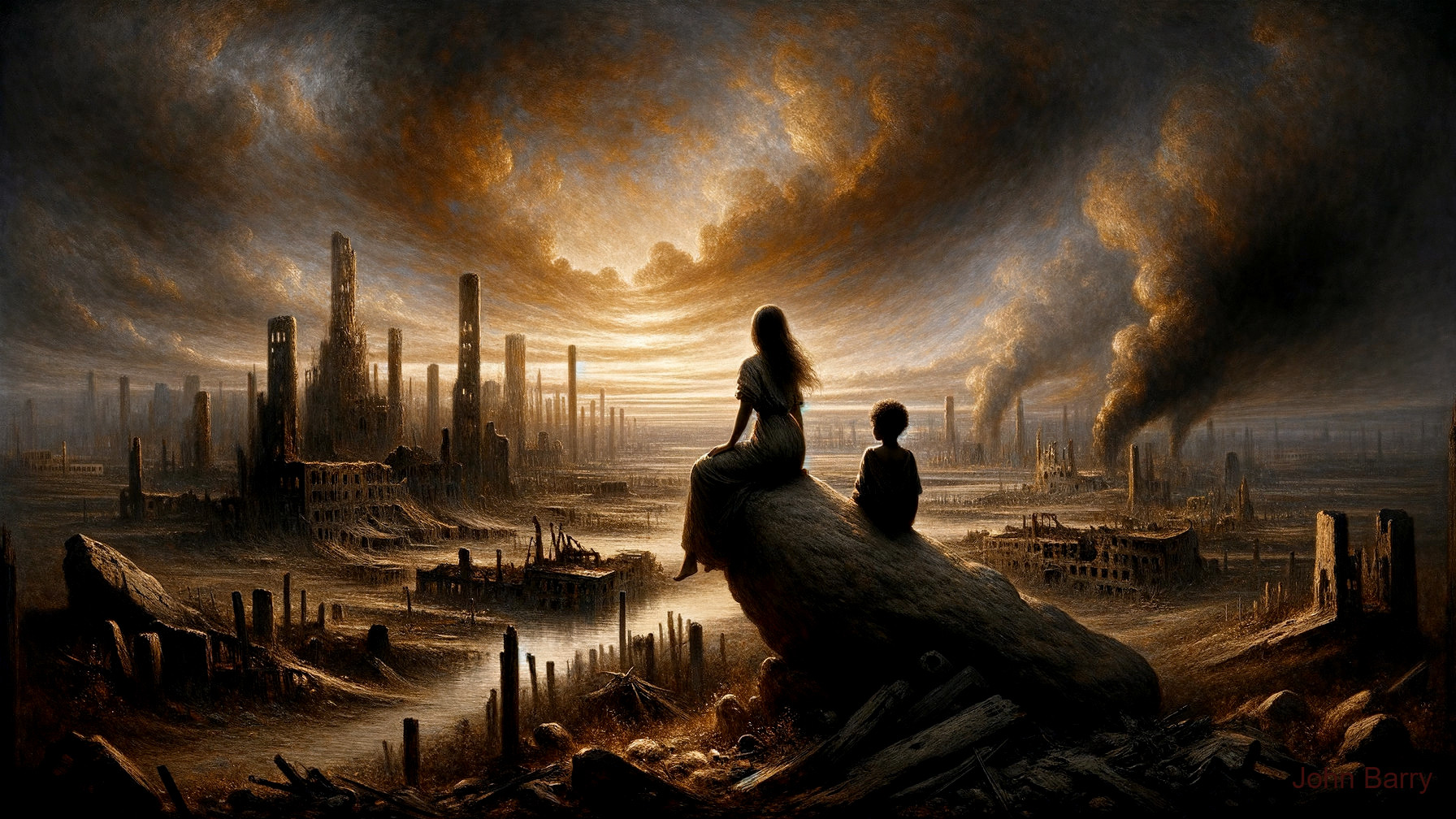 A poignant scene of two figures, a woman and a child, perched on a rock amid a vast, desolate landscape. Ruined structures and dark clouds loom under a dramatic sunset, evoking a sense of loss and hope.