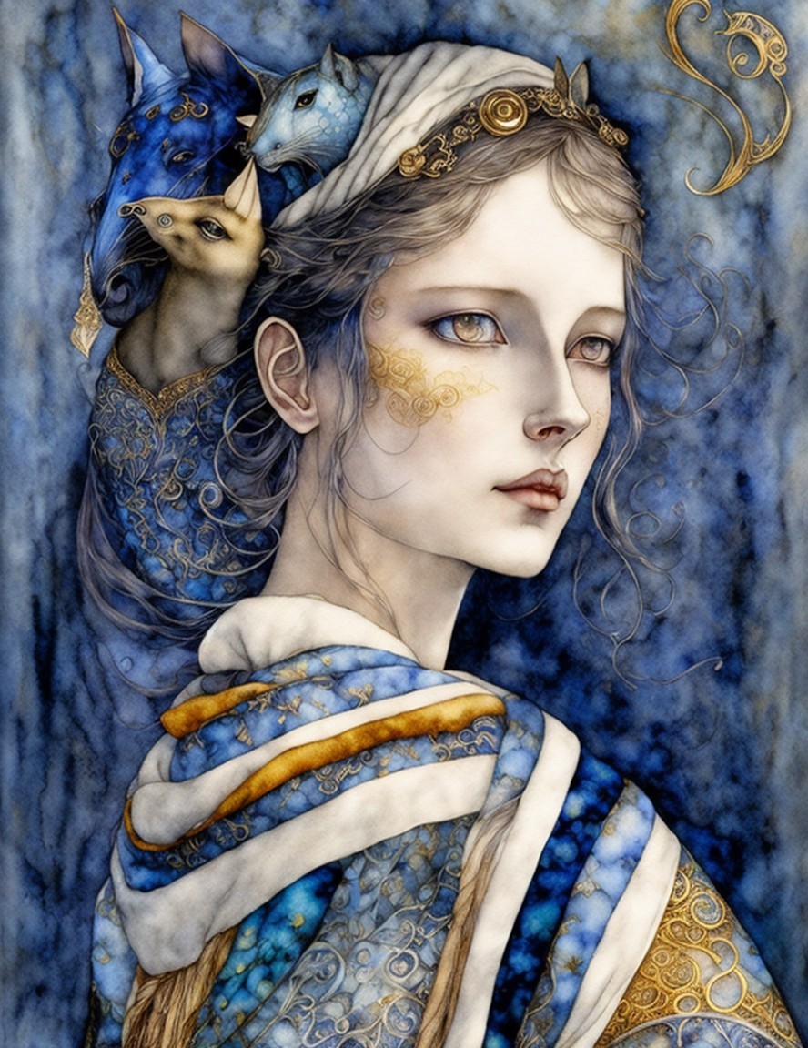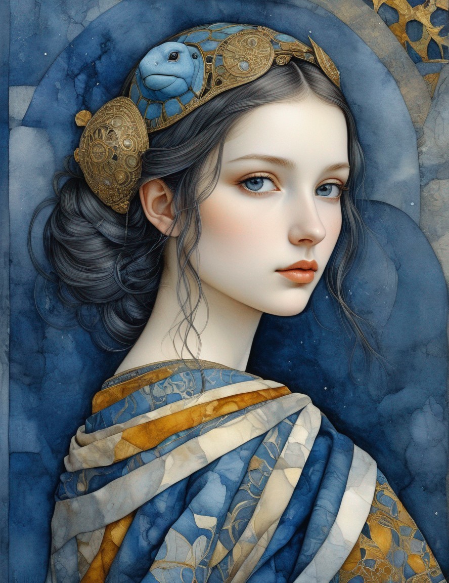 A digital artwork of a woman with a blue halo, holding a tortoise, featuring intricate gold details and a mosaic-like blue background.