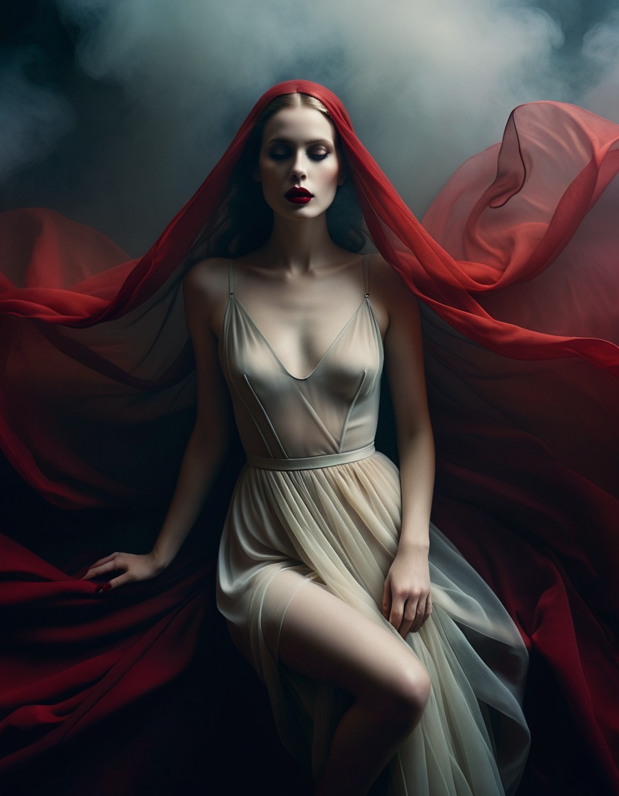 A striking figure draped in flowing red fabrics sits gracefully, her pale gown contrasting with dark, moody clouds. Her bold red lips and dramatic veil enhance the ethereal atmosphere.