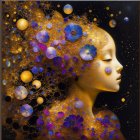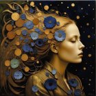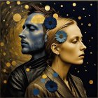A striking portrait featuring a man with blue-toned skin and a woman in a vibrant outfit, set against a circular, abstract background of gold and blue hues, creating a captivating contrast.