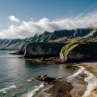 A stunning coastal view showcasing rugged cliffs covered in greenery, gentle waves lapping at the sandy shore, and dramatic clouds creating a picturesque sky above the serene ocean.