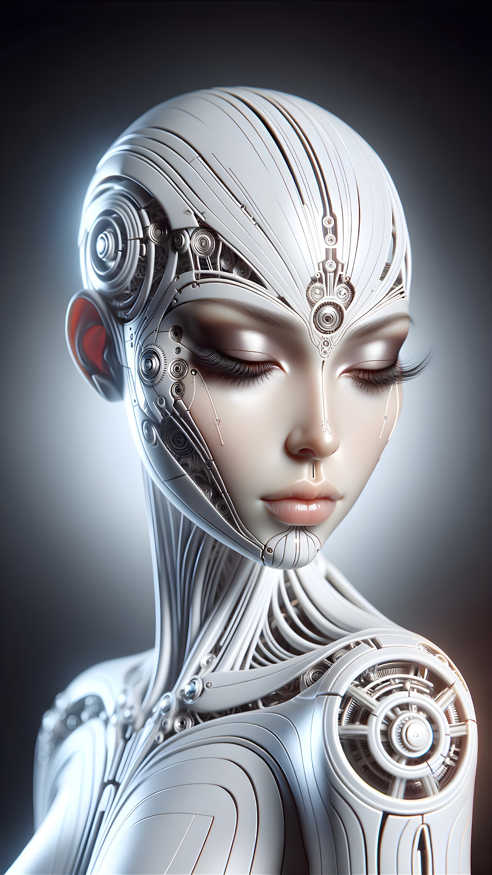 A stunning 3D-rendered female cyborg with intricate biomechanical elements and a goddess-like aura. The artwork features ultra-high 8K resolution, detailed features, and a futuristic design.