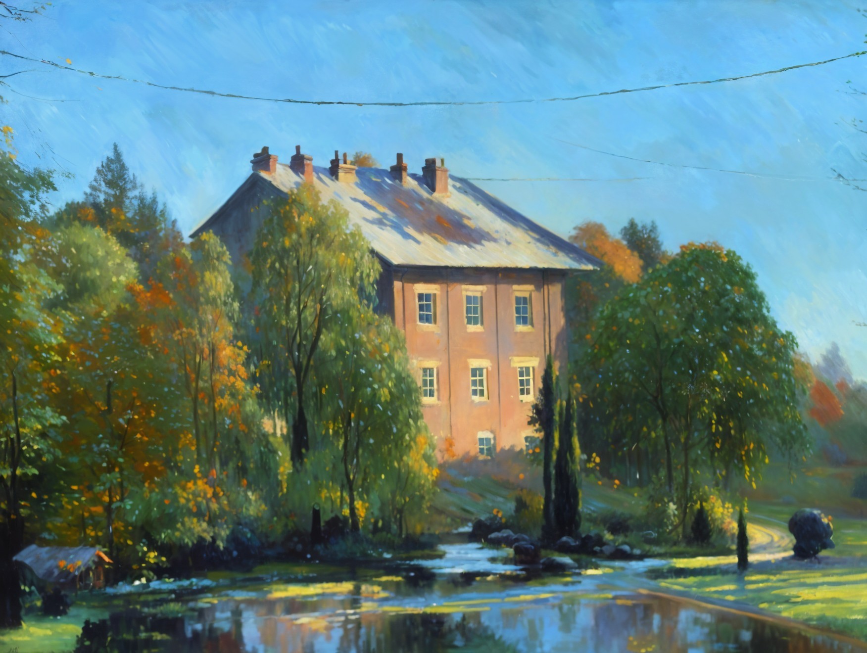 A serene landscape features a charming, pastel-colored house surrounded by lush greenery and stylized trees. A winding pathway invites exploration under a bright blue sky.
