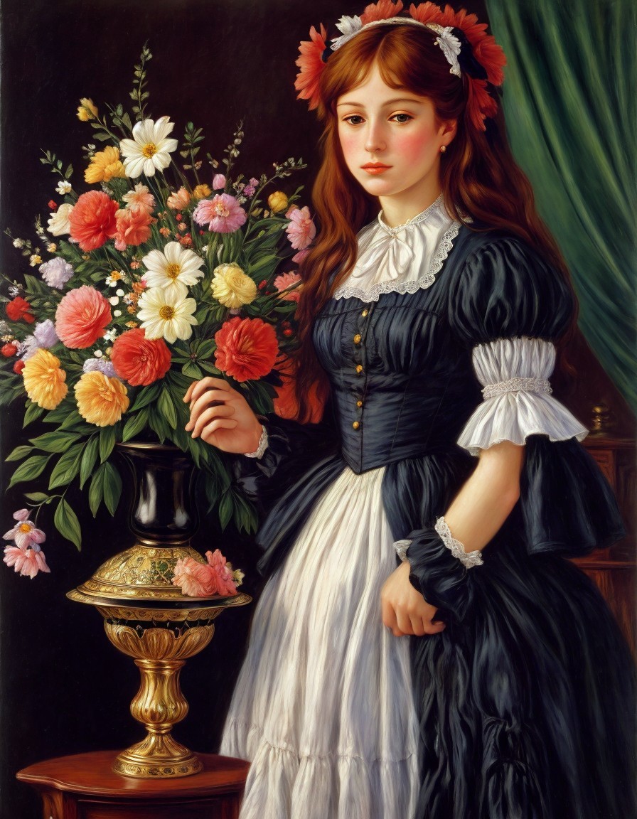 A painting of a woman in vintage attire with a red ribbon in her hair, standing beside a vase of colorful flowers.