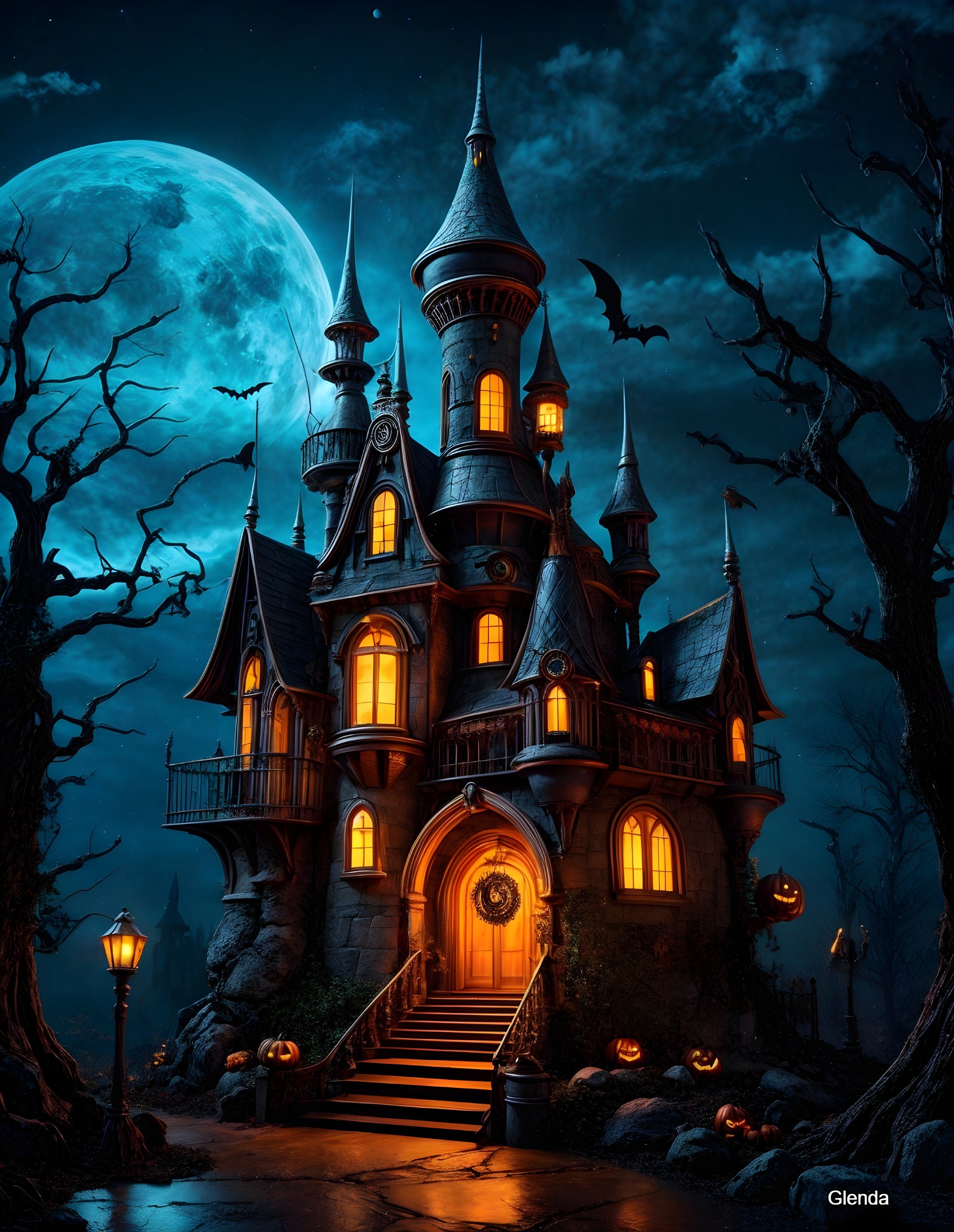 A spooky, gothic castle looms under a full moon, with bats flying overhead. Its warm, orange lights glow from the windows, surrounded by carved pumpkins and eerie, twisted trees.