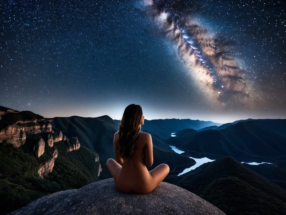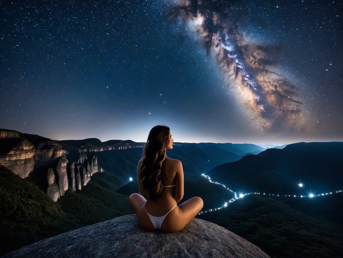 A serene scene featuring a woman in a bikini meditating on a rock, illuminated by the Milky Way and shooting stars in a night sky, with a scenic valley and lights below.