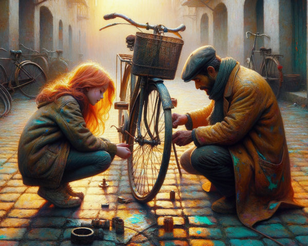 Painting in the style of abstract expressionism and mosaic, depicting a young girl with flowing, fiery orange-red hair that transforms into abstract waves and swirls, reminiscent of lava. She walks towards the right side of the frame, carrying a glowing orange lantern in her left hand. Her hair dominates the upper