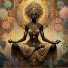 A haunting silhouette of a woman in a dress sits in a meditative pose, surrounded by shadowy trees. The background features a warm, glowing light that contrasts with the dark figure.