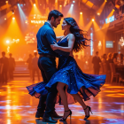 A couple dances closely in a vibrant, illuminated venue. Colorful lights cast a festive atmosphere as the elegant woman in a black dress twirls gracefully, embodying romance and passion.