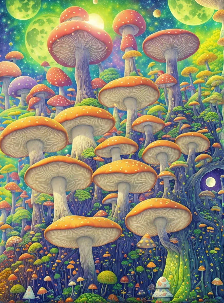 mushroom landscape, small house, giant mushroom trees, giant mushrooms, river, autumn, moon, moonlight, detailed starry sky