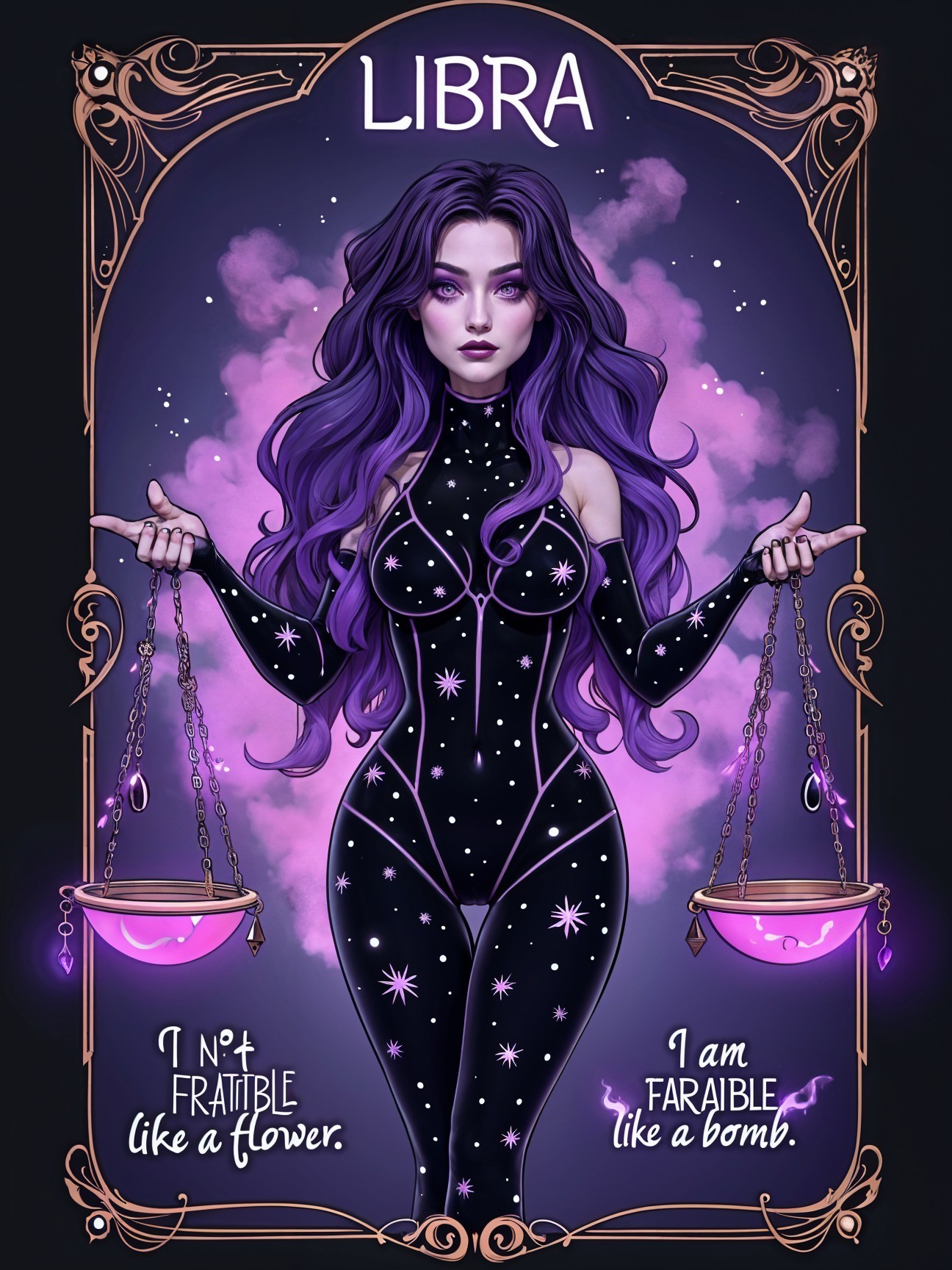 A mysterious woman with long purple hair holds glowing skulls in each hand. Dressed in a black, form-fitting outfit, she exudes an ethereal vibe, surrounded by dark, mystical elements.