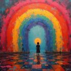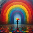 A figure stands under a vibrant rainbow arch, holding a colorful umbrella. The scene is set on a glossy, circular-patterned ground, surrounded by soft clouds, creating a whimsical atmosphere.