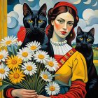 A woman in traditional clothing stands in a vibrant landscape, holding two cats, surrounded by colorful flowers with rolling hills and a serene lake in the background.