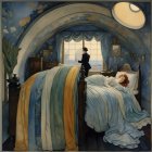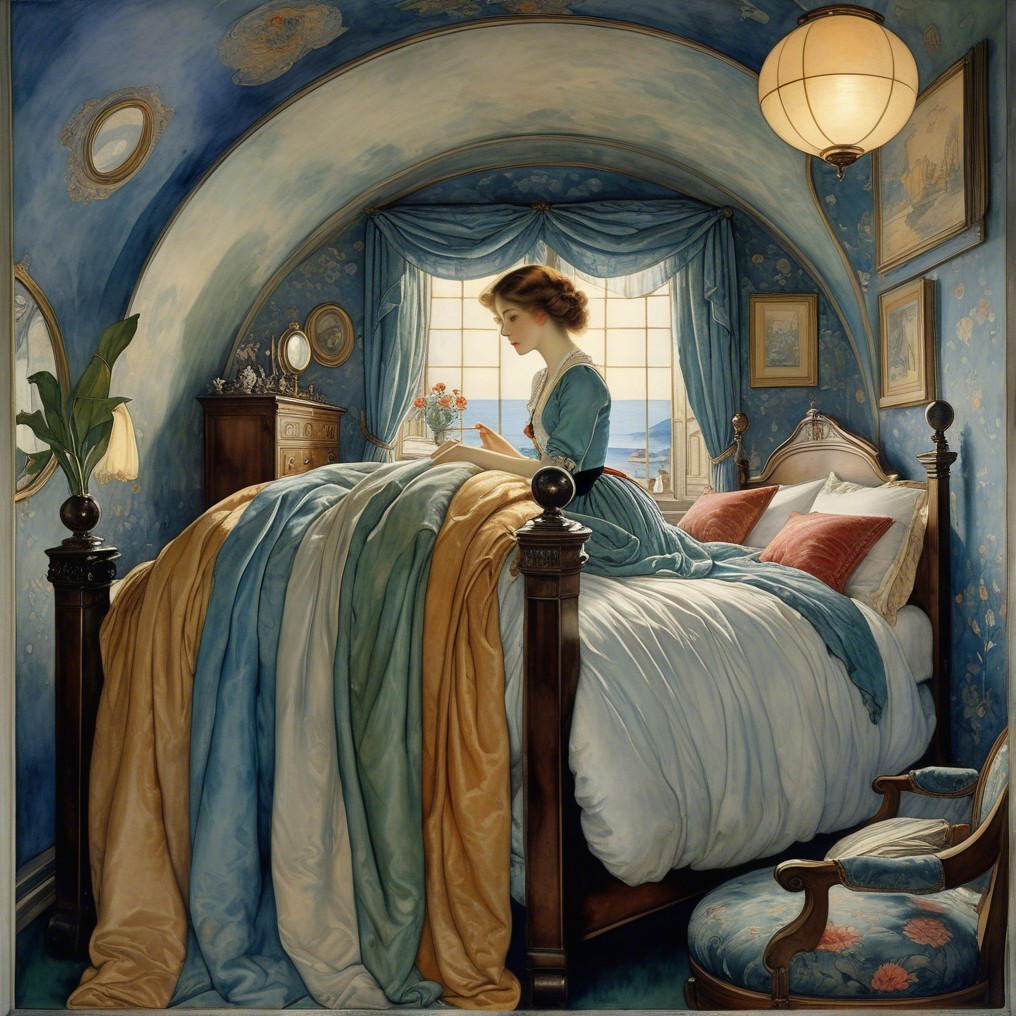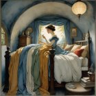 A serene scene captures a woman in a colorful gown, sitting by a sunlit window in a cozy, curved bedroom. Soft drapes and warm hues create a tranquil, dreamlike atmosphere.