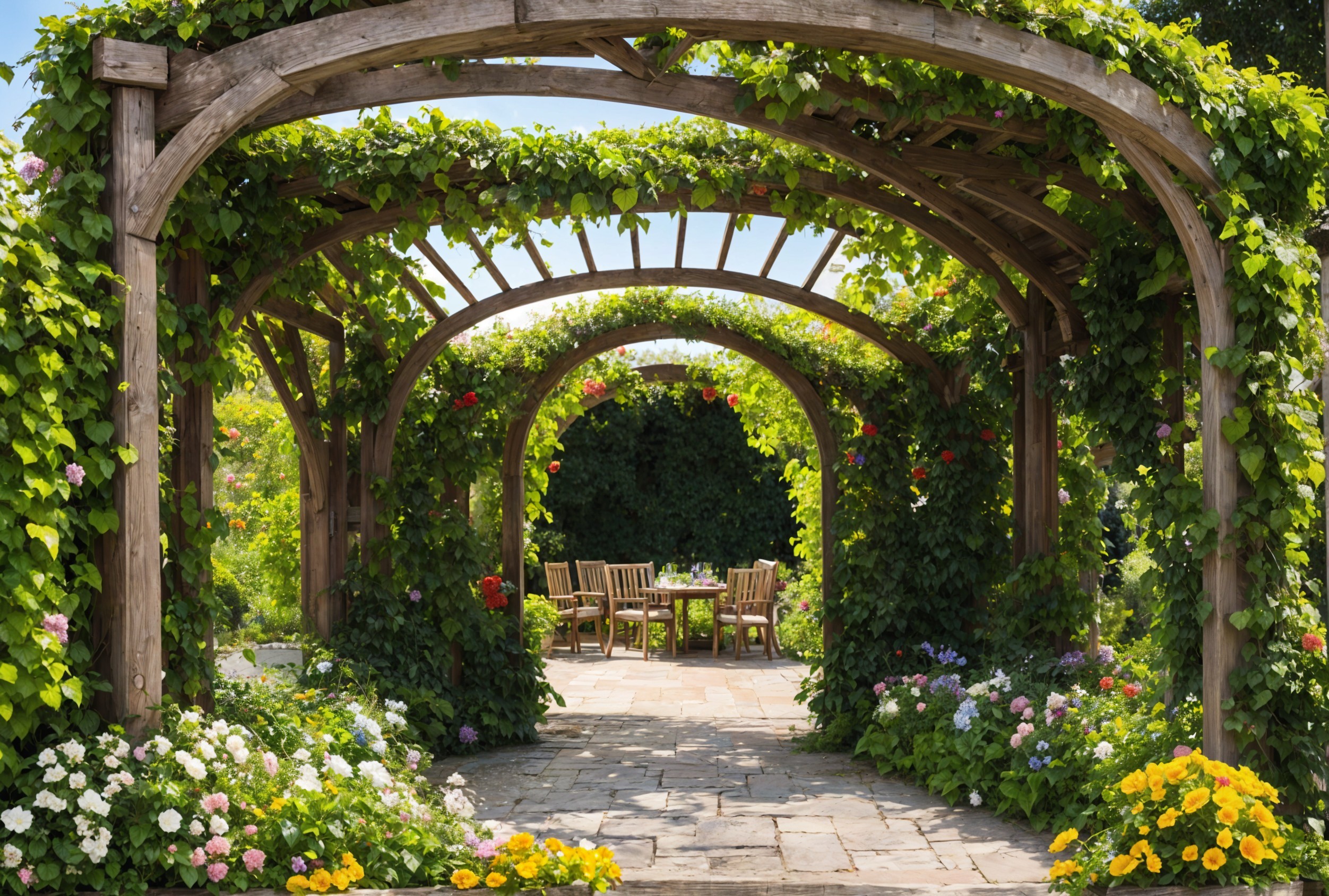 A charming garden scene featuring a wooden arbor covered in lush vines. A stone pathway leads to a cozy dining area with wooden furniture surrounded by colorful flowers. Bright and inviting atmosphere.