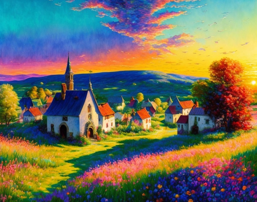 Full page, single image, 3D watercolor patchwork, extremely beautiful old village, spectacular sunrise, meadows filled with beautiful high resolution, sparkling flowers, satiny, high quality, shimmering, elegant, with vibrant saturated colors, highly detailed, glistening, by Monet, with elements in the style of Jan Toorop