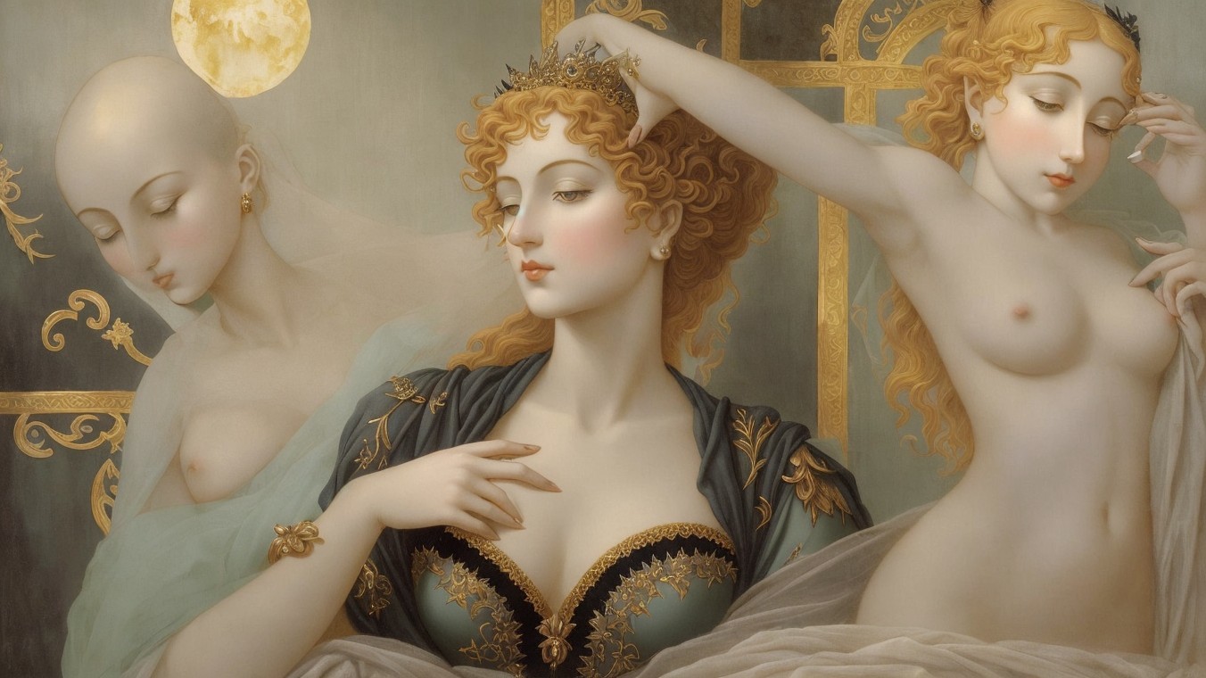 The image features two elegantly portrayed women with flowing hair, one dressed in ornate attire and the other partially draped. A glowing moon and ethereal background add a mystical ambiance.
