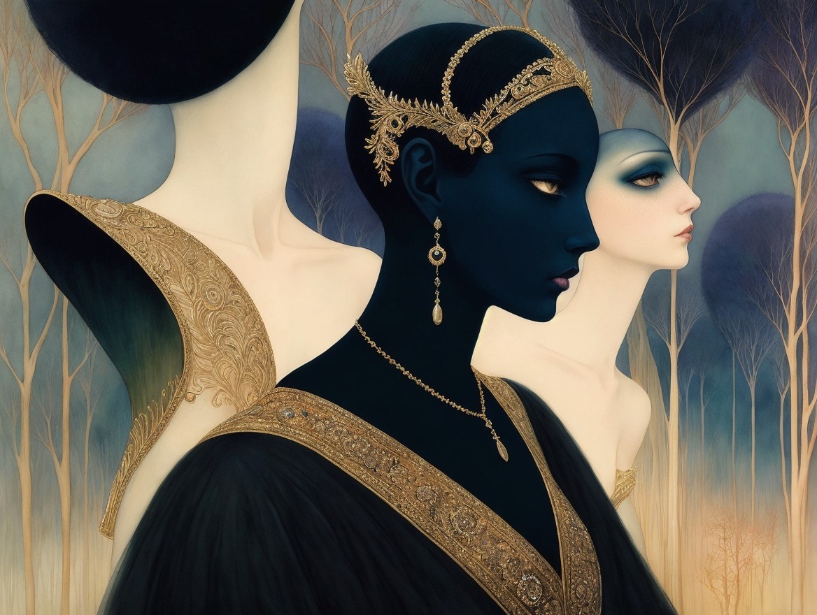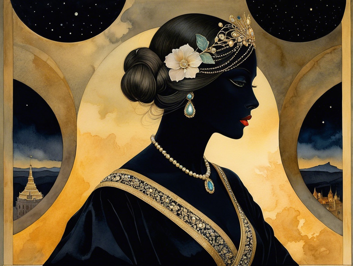 A silhouette of a woman adorned with gold jewelry and a floral headpiece, set against a moonlit sky. Her dark skin contrasts beautifully with the celestial background, evoking elegance and mystery.